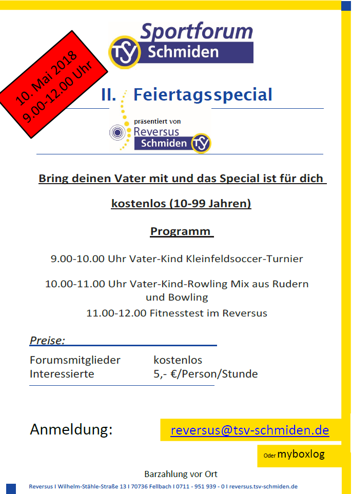 Am 10. Mai wird euch nun vom Team Reversus, passend zum Vatertag, ein Vater-Kind-Special präsentiert. Wer also seinen Vater mitbringt, der trainiert kostenlos. Auf dem Programm steht an diesem Tag folgendes: